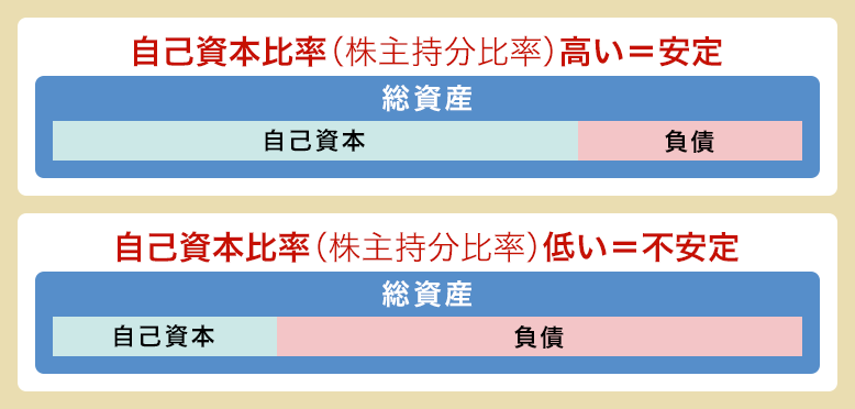 「返済の必要がない資金=自己資本(株主持分)」が多ければ、その会社は安定しているという事。倒産のリスクも少ないわ。自己資本比率は、%で表されて、値が高いほど安定している証よ。 目安は「40%〜90%」ならかなり優良、10%を下回ると危険水域、0%以下の場合は債務超過ということよ。 ※中小企業は、借入金に頼らざるを得ない状況も多く、15%くらいが平均とされているわ。 でも実は、自己資本比率が“高すぎる”会社にも、落とし穴があるの。 POINT